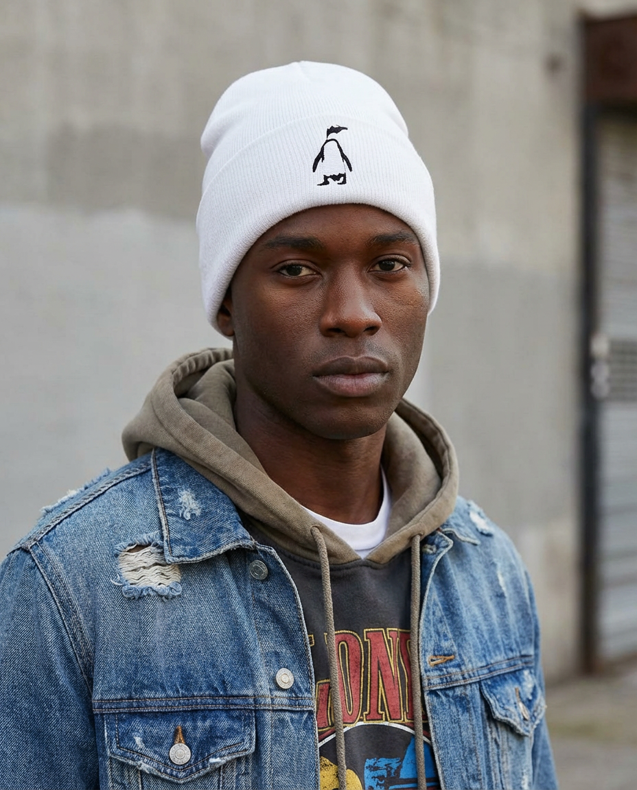 Dancing Penguin Embroidery. This adorable beanie is looking for a Non-Profit to support at the moment! Rest assured, all purchases are documented and a fine home for this Beanie to support will come soon! Image is the Dancing Penguin, taken by Robert Moss, in South Africa.