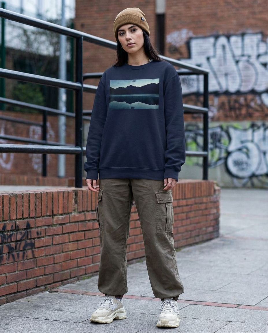 Embrace the serene beauty of Glacier National Park with this Calm Morning Sunrise sweatshirt, featuring an original photograph by Robert Moss. Capturing the quiet magic of a lake reflecting the first light of day as the sun rises over Montana’s mountainous horizon, this piece brings nature’s calm and tranquility into your everyday wardrobe.