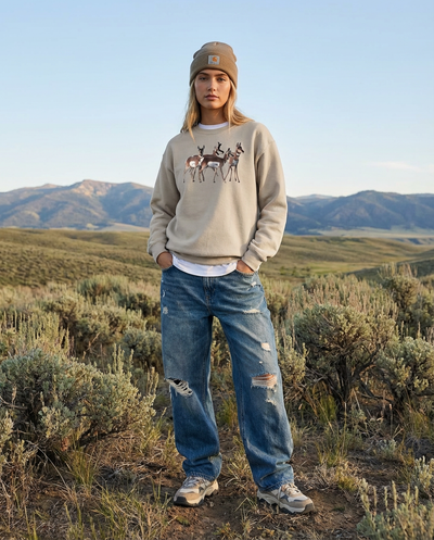 Mule Deer and Barbed Wire Fencing, Wyldlife for Tomorrow, Moss Apparel, Crewneck Sweatshirt